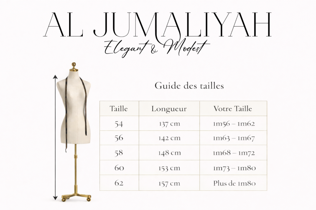 • Si vous mesurez entre 1m56 et 1m62 alors votre taille d’Abaya sera le 54 (longueur abaya 137cm).